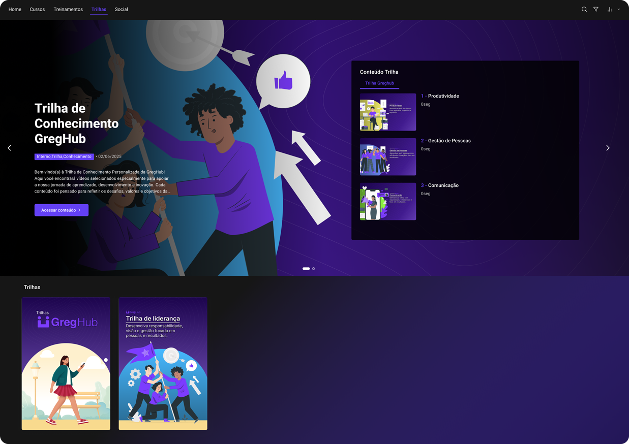 Um hub de conhecimento no estilo Netflix corporativo, com conteúdos centralizados, fáceis de encontrar e relevantes para cada colaborador.
