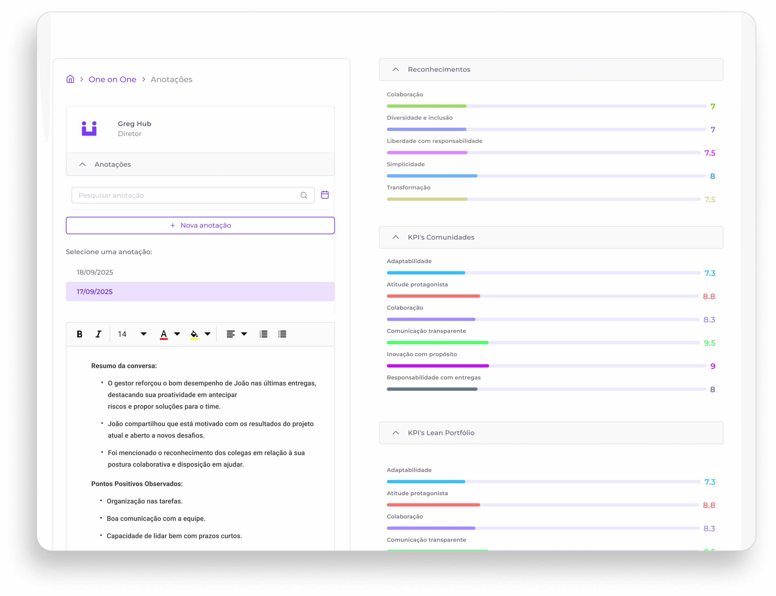 Centralize conversas entre líderes e liderados em um espaço estruturado e contínuo.