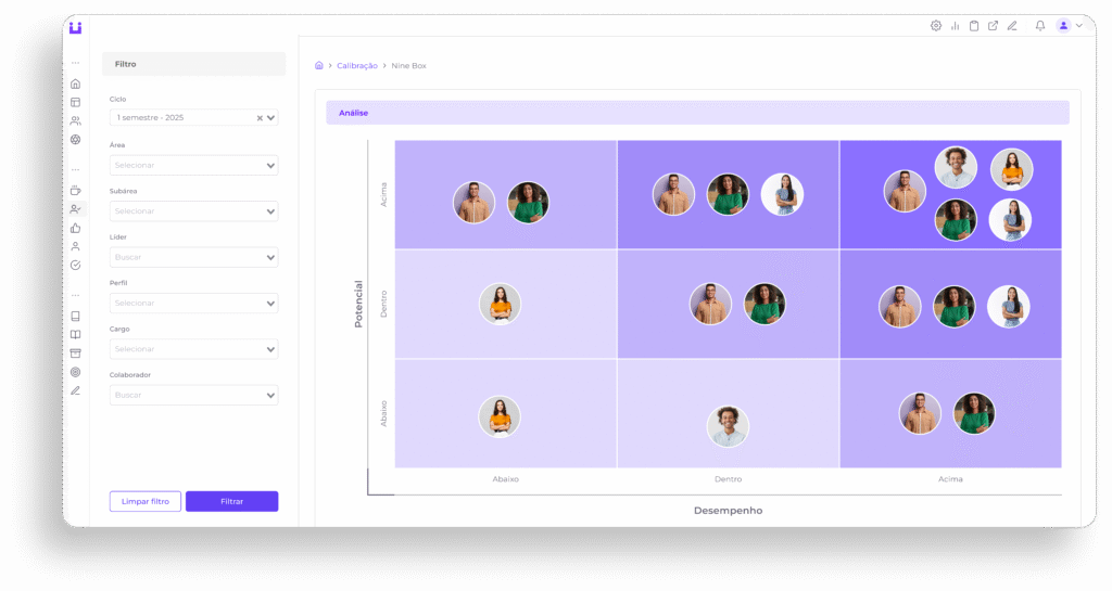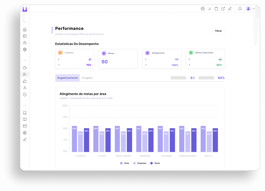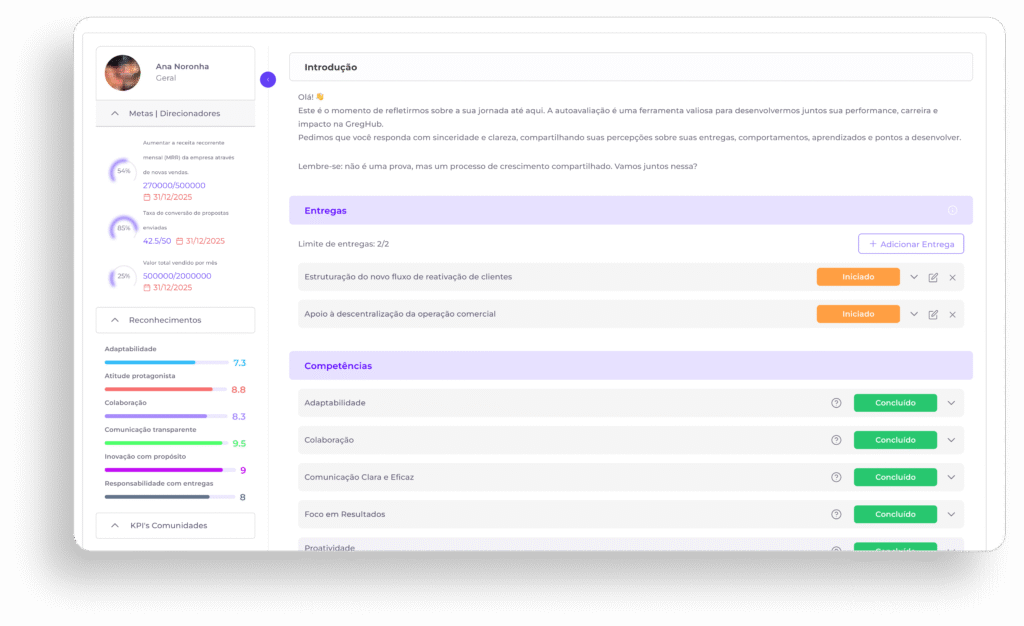 Conecte metas, feedbacks e indicadores em um único sistema. Avaliações objetivas e decisões baseadas em dados.