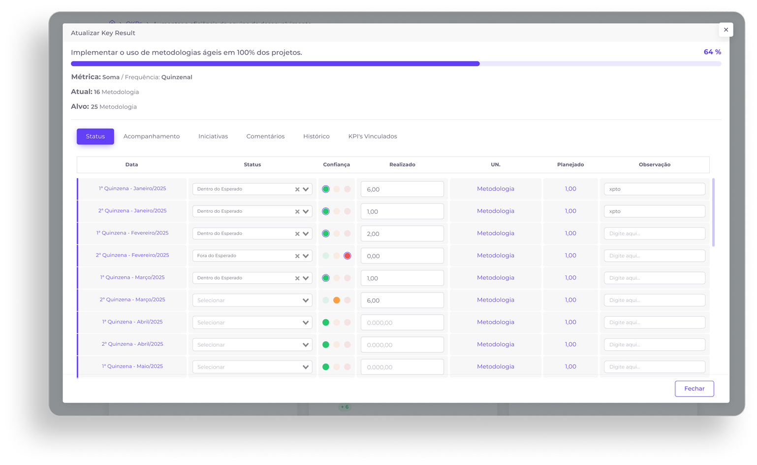 Adicione níveis de confiança para cada meta, ajudando líderes a identificar riscos e tomar decisões com mais previsibilidade.
