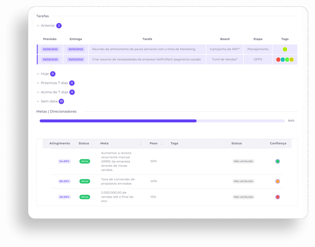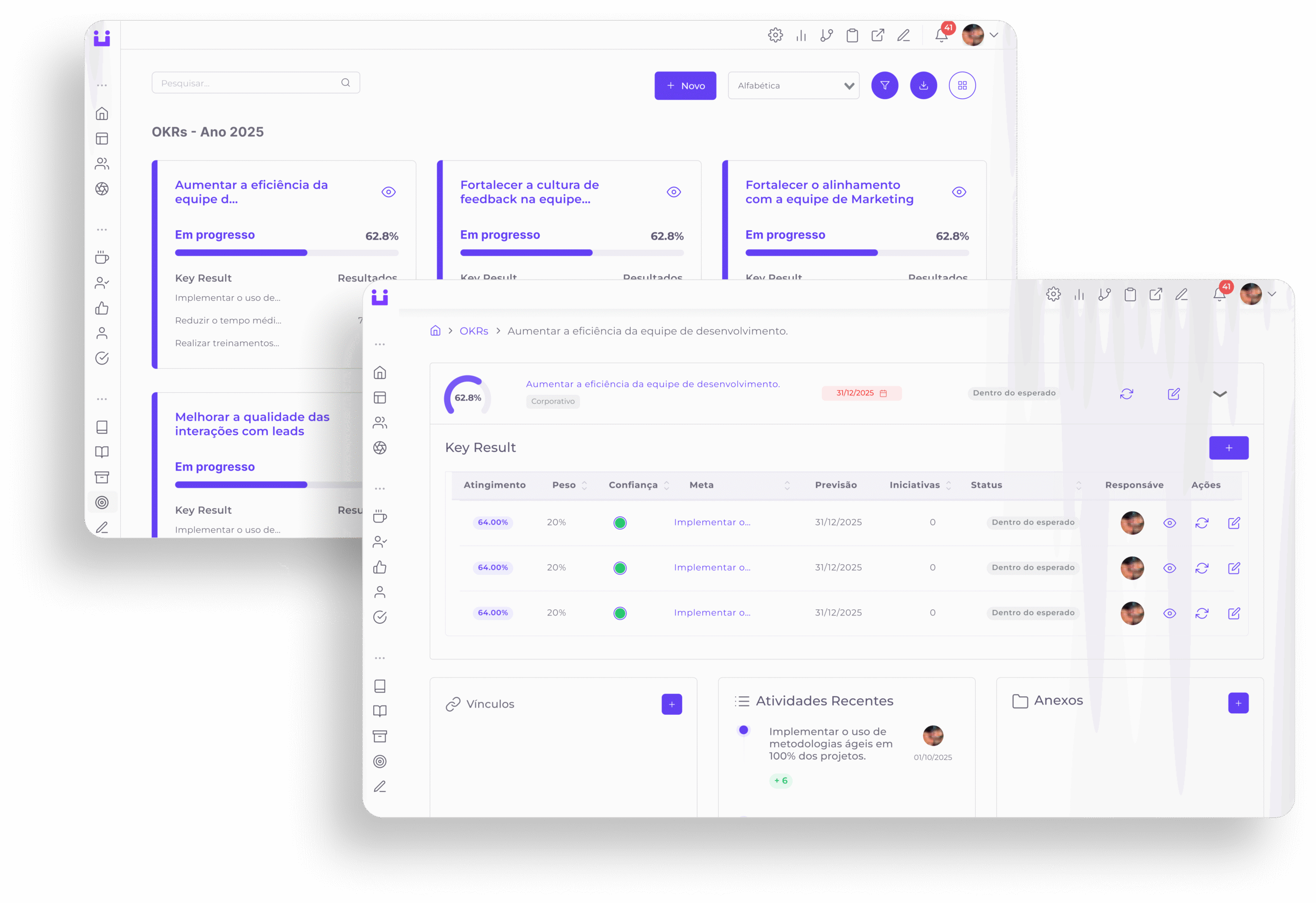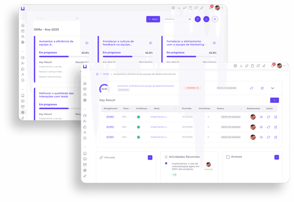 Crie, desdobre e acompanhe objetivos estratégicos e resultados-chave por área, projeto ou colaborador. Conecte iniciativas, indicadores e responsáveis.