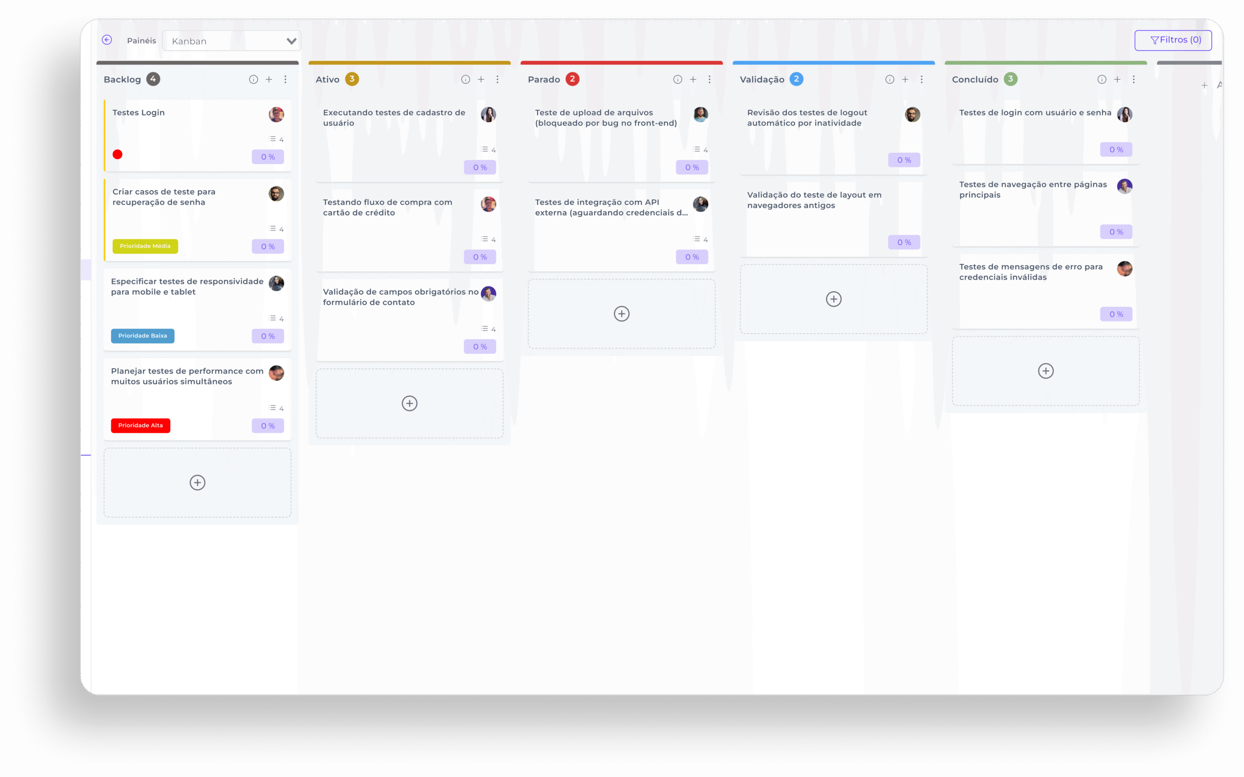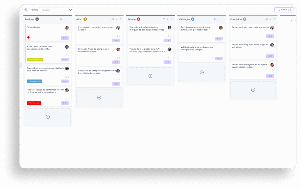 Visualize e gerencie projetos por fases, prioridades e prazos.
