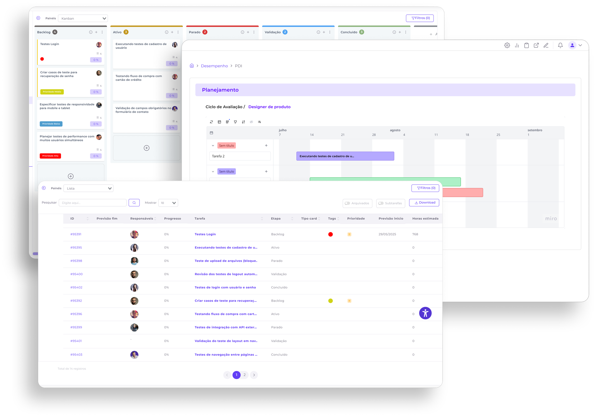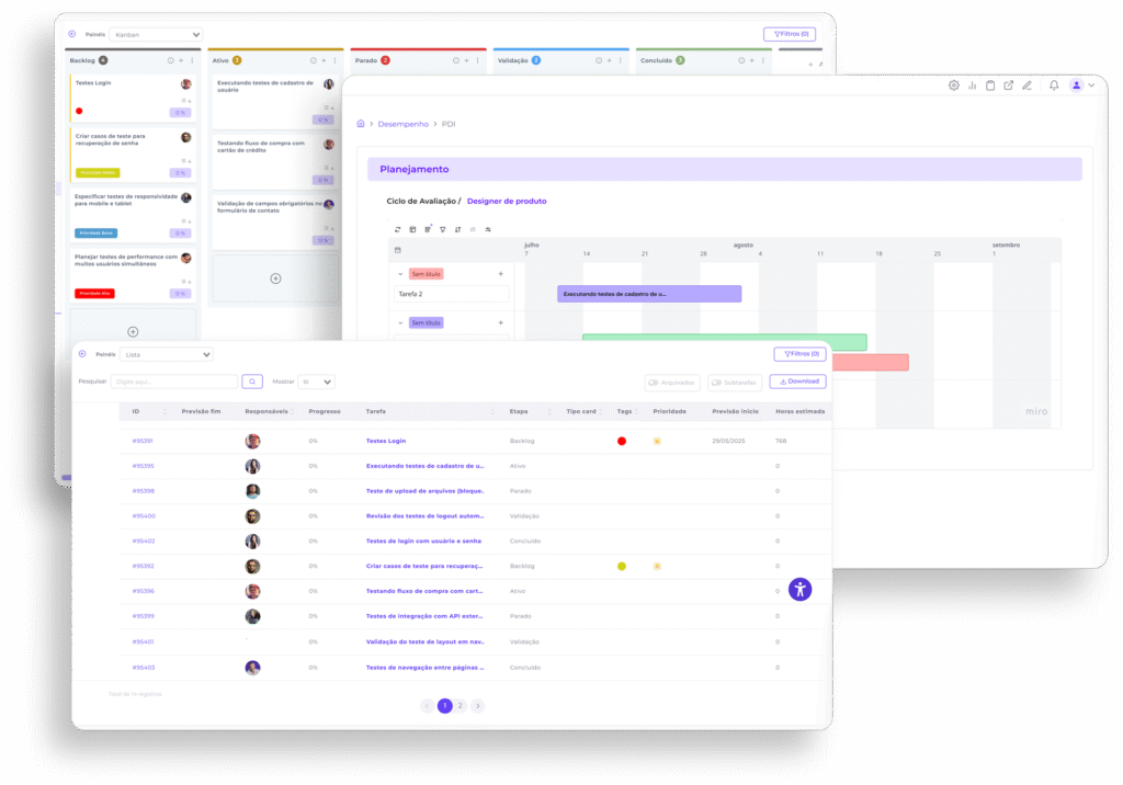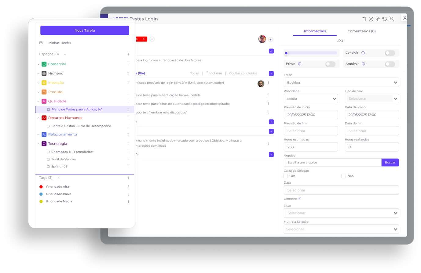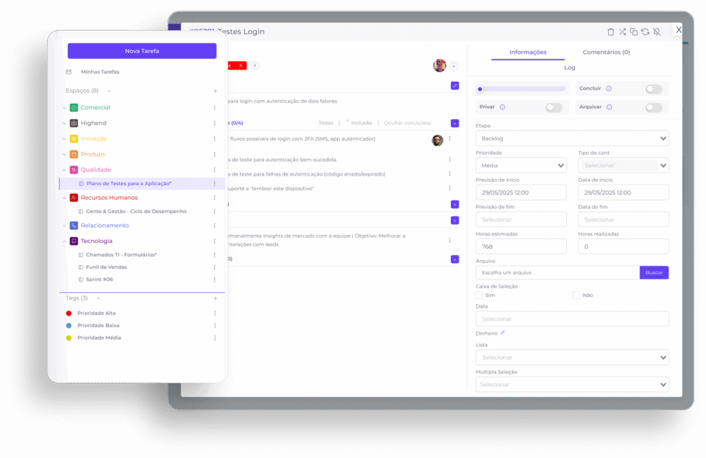 Planeje, distribua e acompanhe tarefas, projetos e times em um único sistema, com visibilidade total do início à entrega.
